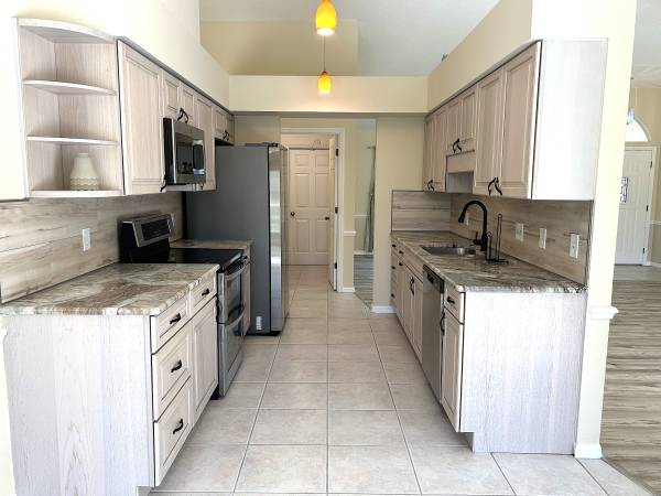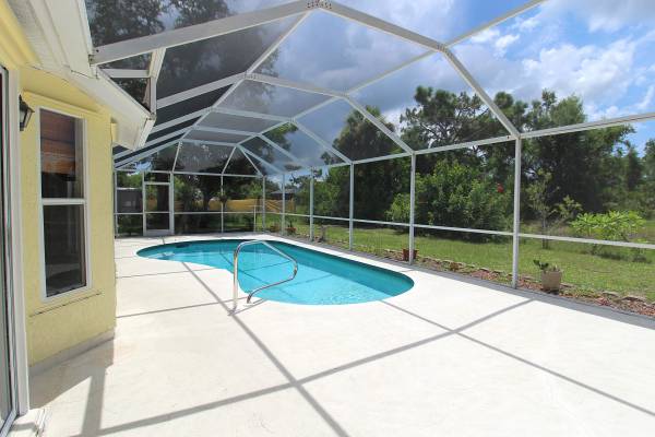 Apply within 24 hours of your conducted showing and once approved you will be credited your application fees towards your first full month's rent! Don't wait any longer! With over 1,500 sq. ft. or living space, this home is the perfect size for your growing family. Additionally enjoy basking in the sun in your screened pool area, complete with a covered patio space and a pool for those warm Florida days! Enjoy the sparkling pool without the hassle, as professional pool care will be scheduled regularly for hands-off maintenance! Details to this home include vaulted ceilings, neutral paint and large windows throughout, tile flooring, and wood plank laminate flooring, making decorating every corner of this home a breeze! The kitchen is a chefs dream, complete with granite countertops, and ample cabinets for all your storage needs. Appliances are stainless-steel and include a refrigerator, microwave, dishwasher, and a range with a double-oven feature! You will have two areas for hosting dinner parties with friends, both in the eat in kitchen area adjacent to the kitchen, and a formal dining space in the open concept living area! The options for this space are endless, creating an inviting atmosphere for any decor style of choosing! The primary bedroom will be your daily retreat, complete with surrounding windows to ensure plenty of natural lighting, plus a walk-in closet and an en suite bathroom with custom tiling throughout. There is space for everyone in the family, with two additional bedrooms down the hall and a roomy shared bathroom with a shower and tub combo. Laundry days will be a breeze with the help of a full-sized laundry room, complete with a washer and dryer for convenience. Enjoy the added perk of a backyard shed perfect for extra storage and everyday convenience! Pets are negotiable, but no dangerous breeds.