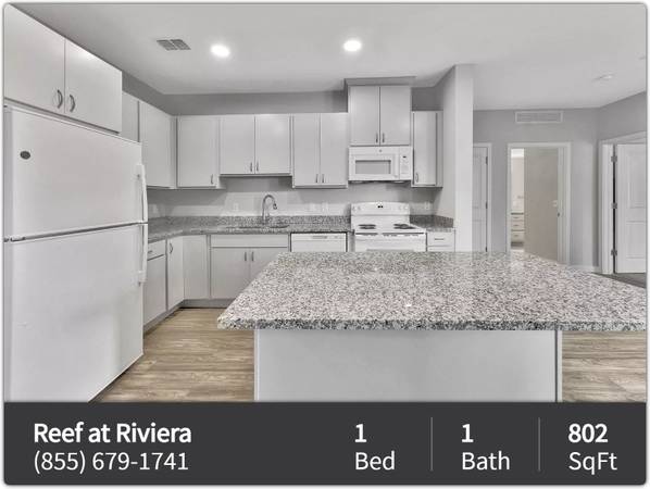 The Reef at Riviera is now leasing incredible 1, 2, and 3 bedroom apartment homes featuring vinyl plank flooring in the main living spaces, carpeted bedrooms, modern cabinetry, granite counters, paneled doors, and ample closet space. Enjoy the convenience of an on-site library, full kitchen, theater room and fitness center, large outdoor courtyard space, and more! Every feature here at the Reef at Riviera has been designed with you in mind.