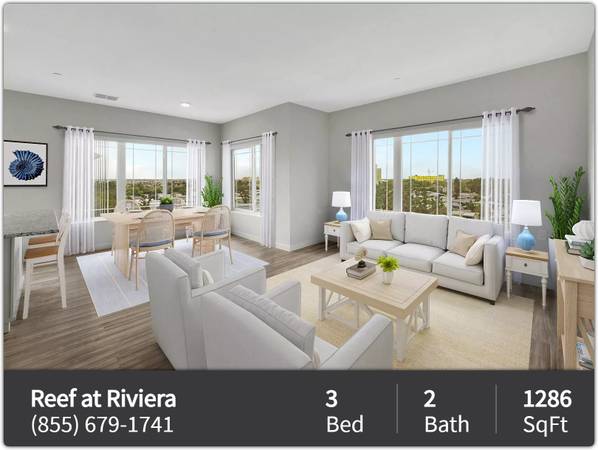 Description: The Reef at Riviera is now leasing incredible 1, 2, and 3 bedroom apartment homes featuring vinyl plank flooring in the main living spaces, carpeted bedrooms, modern cabinetry, granite counters, paneled doors, and ample closet space. Enjoy the convenience of an on-site library, full kitchen, theater room and fitness center, large outdoor courtyard space, and more! Every feature here at the Reef at Riviera has been designed with you in mind.