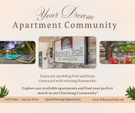 Discover your own private sanctuary at Banyan Trail Apartments. Centrally located close to sugar sands of Siesta Key and a short drive to the art culture of downtown Sarasota, we are just where you want to live. Lush landscaping pulls you into our relaxed community, but the charming staff, tranquil banyan tree, inviting pool with sun deck and fire pit is what will make you never want to leave.