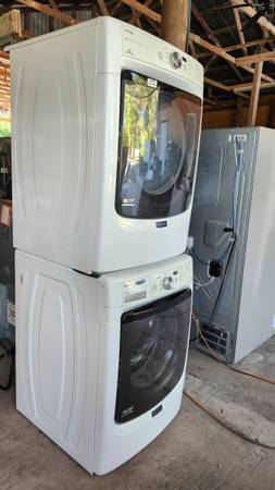 Maytag front loads washer and dryer set can be used as stackable or side by side everything works delivery and installation available for extra 50 local no upstairs