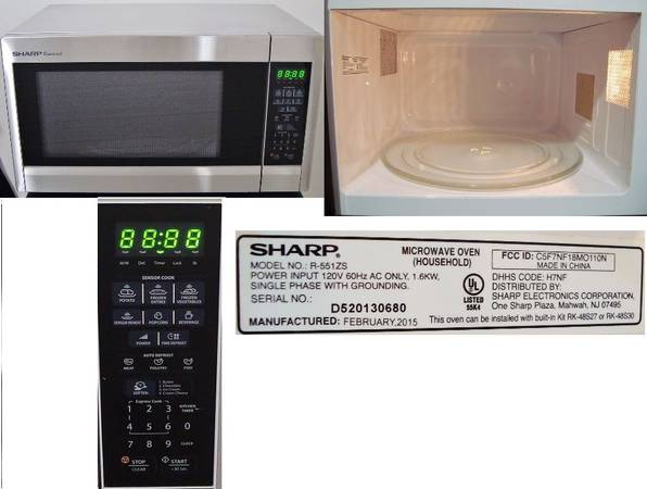 Pic 2) Sharp full size countertop microwave. Model R-551ZS, made Feb 2015. 1100W, 1.8 cubic ft inside (15.5"L, 15.5"D, 10" H inside). 15" diameter turntable. About 23"L, 18.5"D, 13"H outside. 3 ft power cord. Stainless steel trim on the front only, rest of housing is gray paint. Sensor cooking w/6 pre-sets, plus 4 softening settings, timed and auto-defrost, 6 express cooking settings, child lock etc.. Have not tested the sensor cooking other than to make it run on 1. Printed out some of the basic instructions, you can get the whole manual on Sharpusa.com, GOOD idea to read it before you buy. One quirk is that you have to set the power level by pressing the Power button multiple times to step it down, but only takes 2-3 seconds. And only then can you set more exact cooking time like 1 minute 30 seconds, otherwise you can use the numbers to do whole minutes. The turntable is worth more than what I'm asking for it...$30