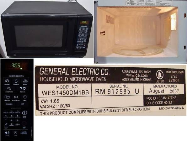 Pic 4) GE countertop microwave. Model WES1450DM1BB. Made Aug. 2007. 1150W, 1.4 cubic feet inside (14.5"L, 14"D, 9"H). Outside is about 22"L, 17"D, 12"H. Turntable is about 12.5" diameter. Push button door latch. 3 ft power cord. Hasn't been used since end of 2019. Worked fine in my tests. Sensor cooking, child lockout, express cook, kitchen timer, 5 pre-sets, auto-defrost, etc. Manual can be found on GE's site, I have the main operating pages saved to a .pdf file I can send. Decided to keep the newer Hamilton Beach one that was on here for a backup, and sell this one. Due to age and needing the room, it's only...$10
