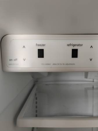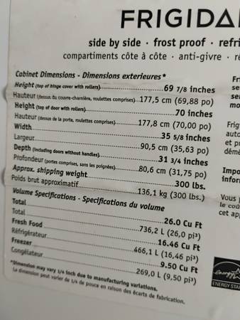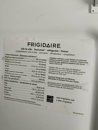 Frigidaire side by side / French door refrigerator. Ice maker, water and ice dispenser, water filter, digital refrigerator and freezer temperature controls. Works great see pictures for better...