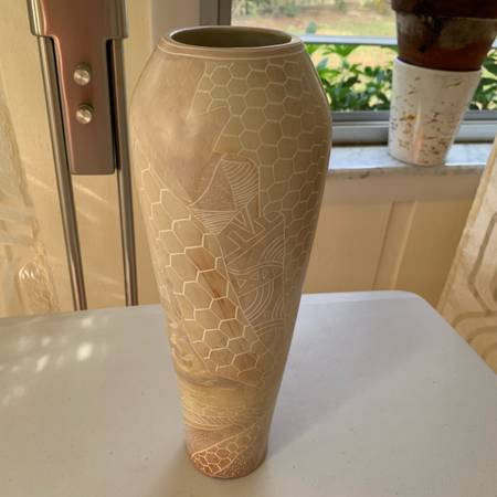 Gorgeous , very rare , unique hand carved stone pastel colors vase. Made in Kenya. Vase 12'' tall, top diameter 2.5'', button diameter 2.4'', the wides part of the vase (around) 14''. Smooth quality of the stone, soft pastel colors with black design and very special hand carved design on this vase will make nice addition in your home decoration. It was a present from my friend, he brought it from Kenya. Vase never been used. Please check all pictures for amazing details. Pet and smoke free home.