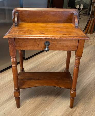Antique 19th Century Wash Stand Nightstand End Table with Drawer. Measures 23.5 inches wide, 15 inches deep and 33.5 inches tall in the back. The table top is 28.5 inches high. There is a single...