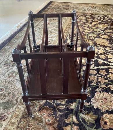 Butler Antique Mahogany Canterbury Rolling Magazine Book Rack #821. Stamped on the bottom ‘Butler Style #821