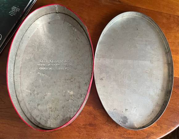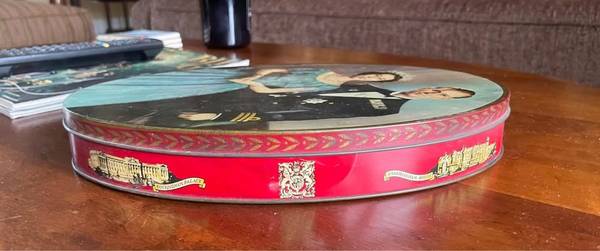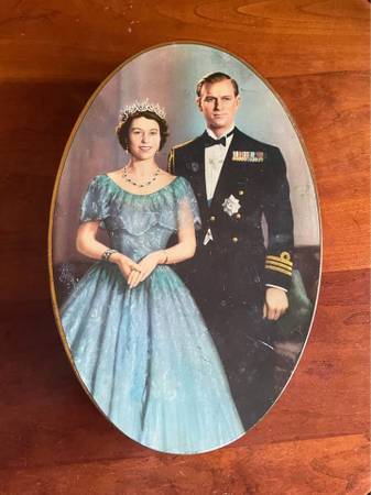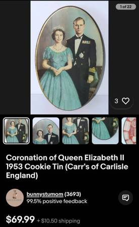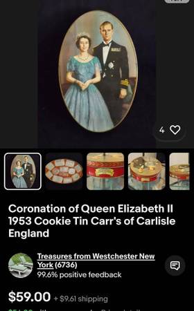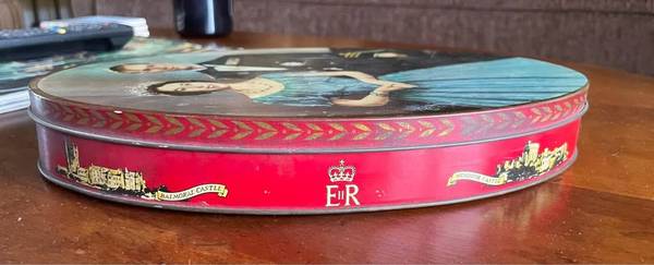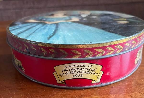 Queen Elizabeth II Coronation Souvenir Cookie Tin Carr’s of Carlisle 1953. Measures 11.5 inches long 7.5 inches wide and 1.5 inches tall. Beautiful Lithography of the couple on the front and balmoral castle, Windsor castle buckingham palace and sandringham house around the edge. These are selling online from $60-$70 as shown.