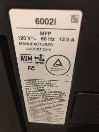 KYOCERA TASKalfa 6002i Copier. Very low hours. One of the copy panel doors has a broken clip and is displaying an error code. Currently this copier is being stored in our storage unit in Osprey, FL.