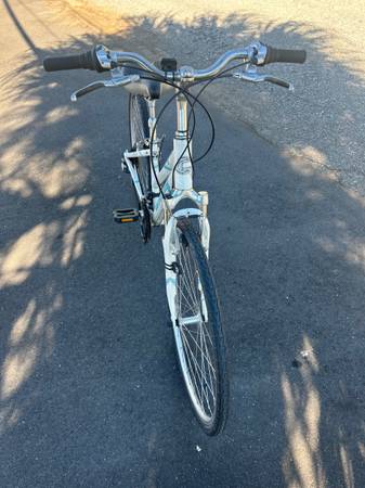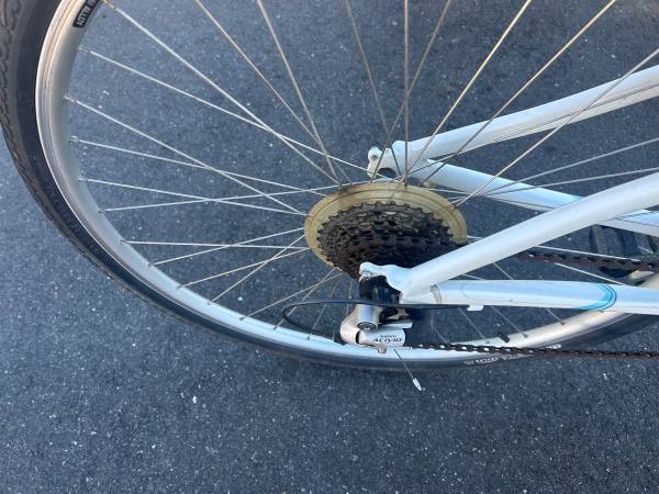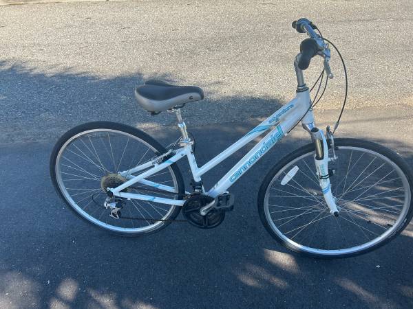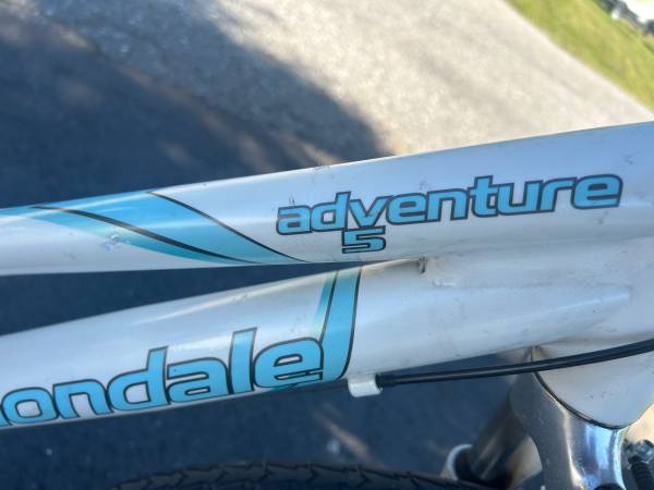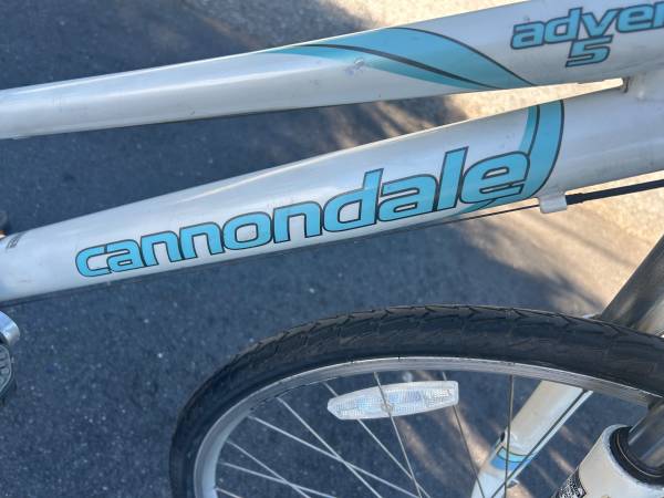 CANNONDALE ADVENTURE 5 24 SPEED HYBRID COMFORT CRUISER. BIG COMFORTABLE SEAT, QUICK RELEASE ALLOY FRONT AND REAR WHEELS WITH EXCELLENT TIRES, FRONT AND SEAT SUSPENSION, AND JUST SERVICED AND READY FOR THE STREET OR TRAIL.