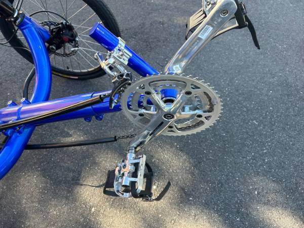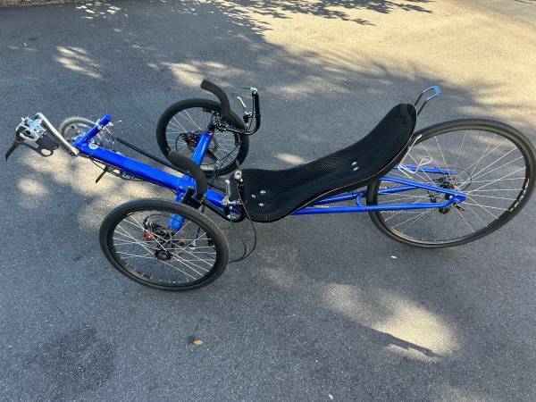VORTRITEK 27 SPEED RECUMBENT TRIKE. THIS IS THE TOP SHELF OF RECUMBENT TRIKES. MORE THAN $4200 NEW, AND CAN’T BE TOLD FROM NEW, THIS TRIKE IS MORE THAN YOU WILL EVER WANT IN A RECUMBENT. HIGH END COMPONENTS, DISC BRAKES, PERFECT TIRES, CARBON FIBER SEAT SHELL WITH UNIQUE CUSHIONING, AND LESS THAN HALF ORIGINAL LIST PRICE.