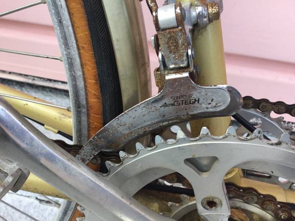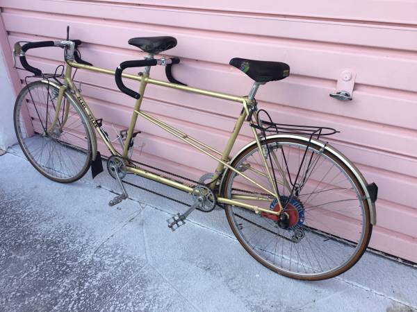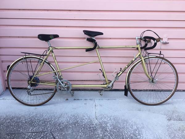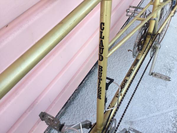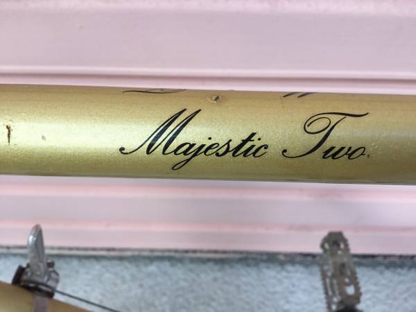 The Claud Butler Majestic Two was made in 1977 to celebrate the Queen’s Silver Jubilee and was made up to 1985. This item was hand built in the 1980’s in England. The frame is Reynolds 531 tubing. The frame size is 23”/58cm for the Captain or front rider and 22” for the Stoker or rear rider. The paint is very good with a few paint chips. Shifts great through all gears. Very good brakes. Tandem racing was an Olympic sport for several decades. Clad Buttler was a British professional competitive racer in the 1920’s and later started making bikes. The derailleurs are Suntour ARX and Suntour AlpineGTech. The tires are 27” x 1.25”. The rims are Super Champion Competition. The caliper front brake and the drum rear brake work well. The gear shifter cables are new. The brake lever hoods are worn. This is a rare bike as they do not come up for sale often in the U.S.
