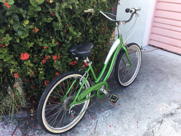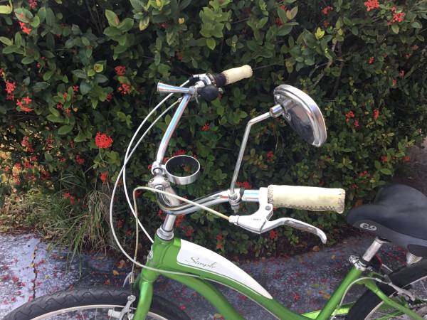 Giant Simple 7 ready to ride. One size fits all by adjusting the saddle height with the quick-release seatpost adjuster. Ladies aluminum frame with a cromoly fork. 7 speeds with a Shimano rear derailleur and a grip shifter. Super clean chain like new. 26” x 2.125” whitewall tires. Cloud 9 saddle. Cup holder, rearview mirror and squeeze horn on the handlebar. Shifts great through all gears. Good linear pull brakes. The paint and decals are in good condition.