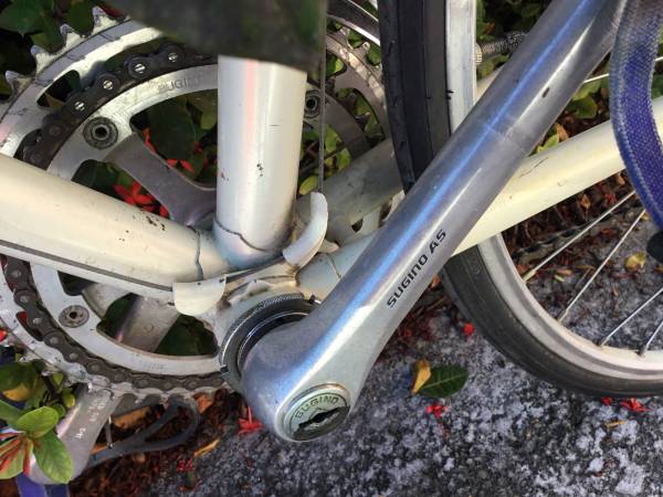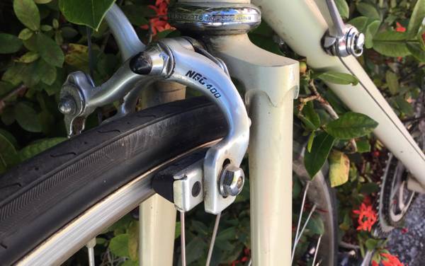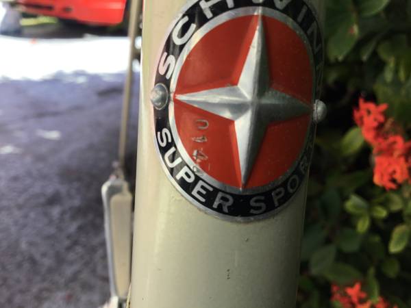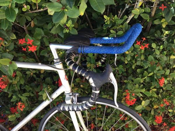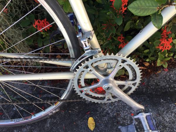 This bike is ready to ride. Shifts into all gears with excellent braking. Good pearlescent white paint. Like new tires. Straight wheels with quick release. Ariake Jaguar Japanese saddle branded Schwinn Competition. 58cm Champion cromoly frame. SP Laprede seatpost. NGC 400 Gran Compe brakes. Suntour Cyclone MKII group with downtube shifters. Aero bar extensions.