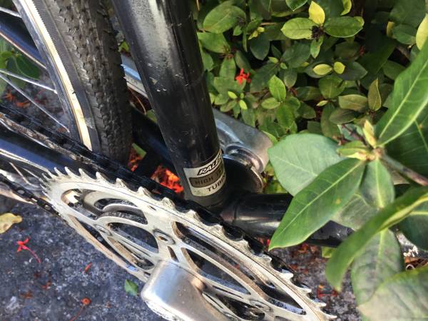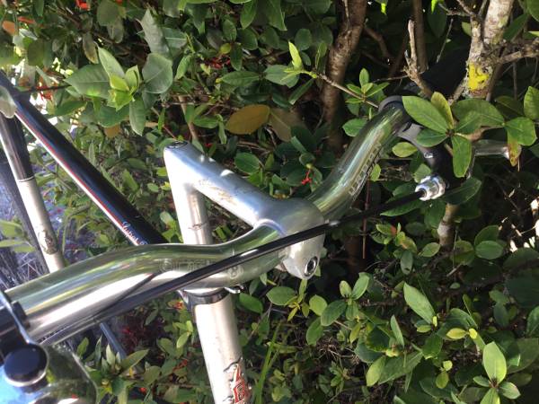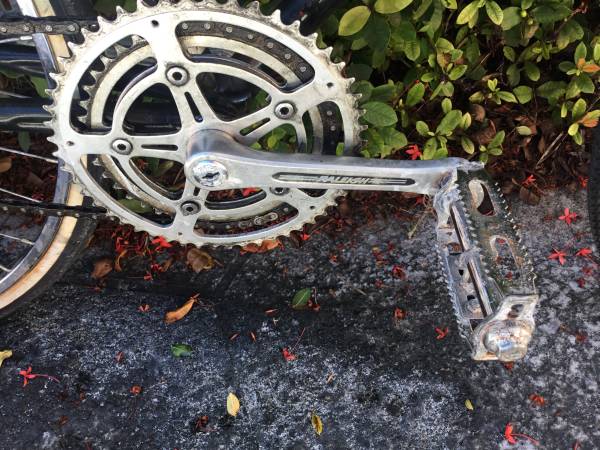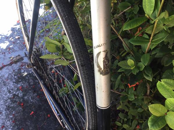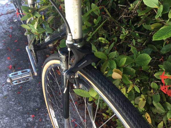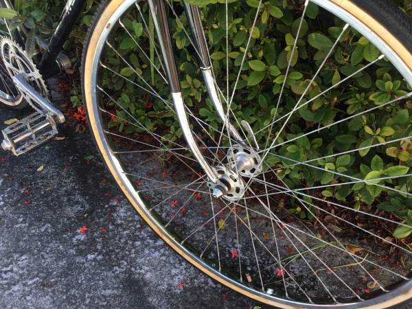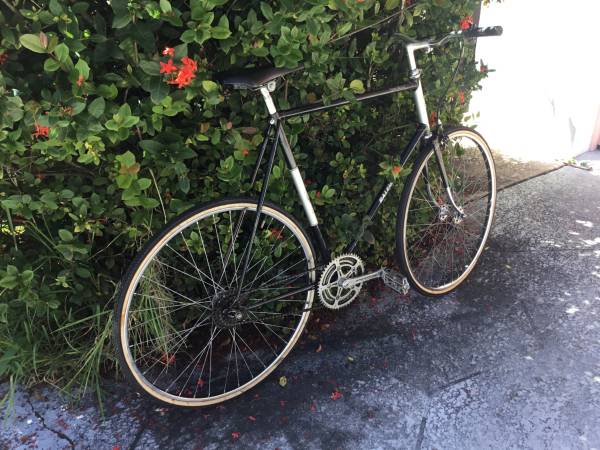 This is a very tall 25”/63.5 cm steel frame with a top tube height of 36”. Front brakes only. 27” x 1 3/8” tires are in very good condition on chrome rims with large flange hubs. New Selle Royal saddle. Classic chrome fork tips. A fixed gear bike means that the cranks are always turning. No coasting or back pedaling like on a single speed bike. New Origin 8 handlebar. New grips. New bell on the handlebar.