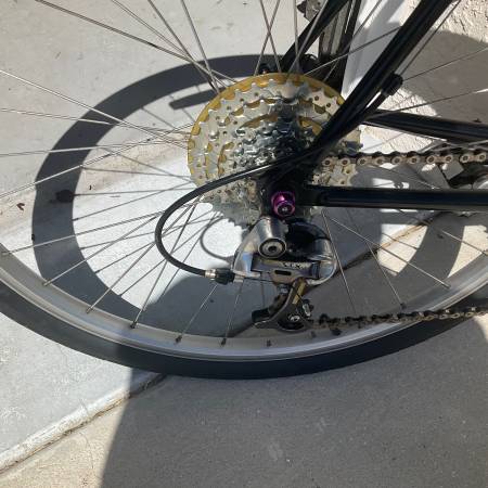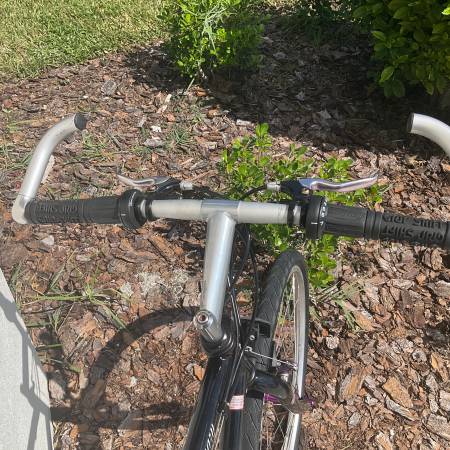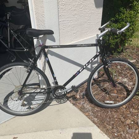 Originally categorized as a non-suspension mountain bike and equipped with knobbies, the bike is now a 21-speed fast riding flat-bar hybrid with center-pull braking and 1.5" wide road tread tires. It is not in brand new cosmetic condition but looks just 3 years old instead of 30.