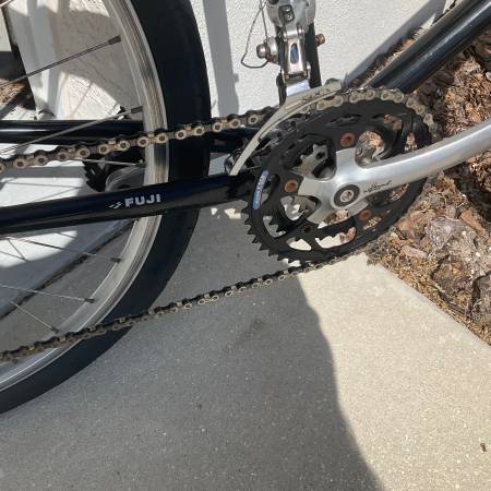 Newly installed puncture resistant road tires and tubes, seat, seat collar, bar ends, skewers, brake pads, chain and sprockets just a few months ago bring this vintage 1995 steel-framed Fuji Taiwan-made bike up to 21st Century standards.