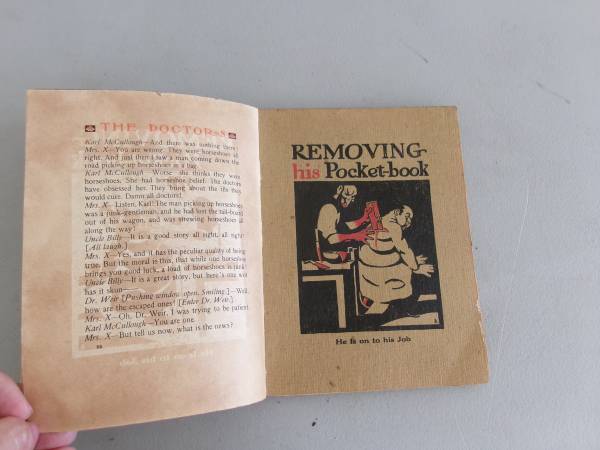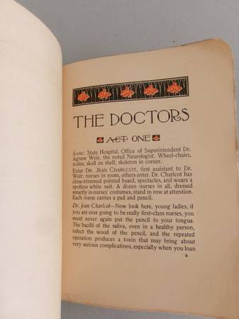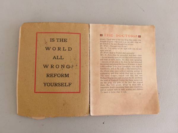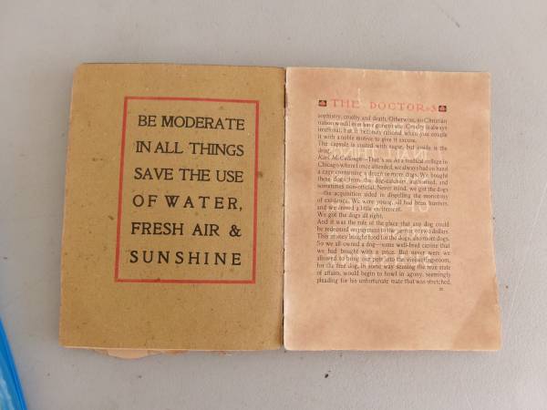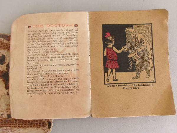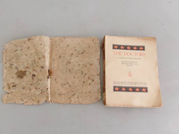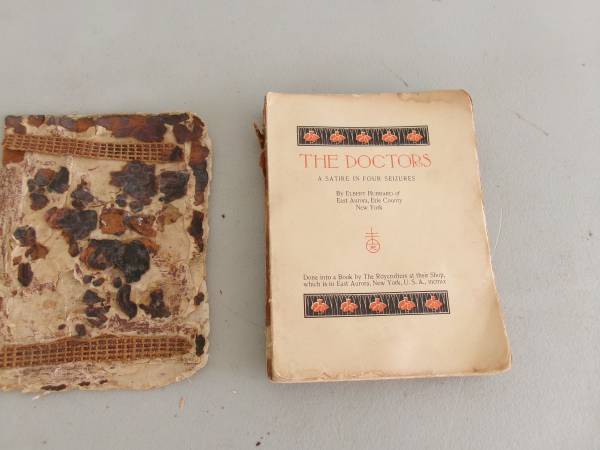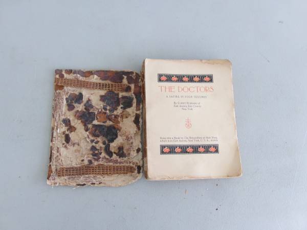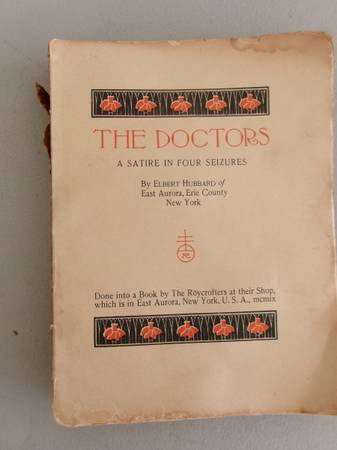 A 1909 copy of "The Doctors/A Satire In Four Parts", vintage book by Elbert Hubbard. This book is in need of some TLC as the front cover is no longer attached. The cover and first few pages are of a very thin paper, similar to onion skin. The inside of the book is in good, clean and legible condition with sturdier pages. The back cover is intact as seen in photos. A fun old book that has seen some things but is still a great vintage read. Would make a great gift for a doctor! $15. For more information, please contact me.