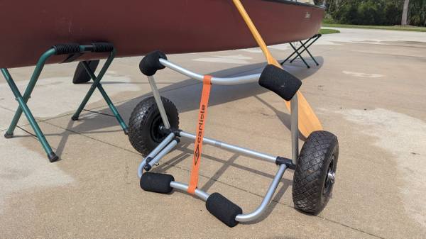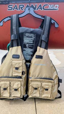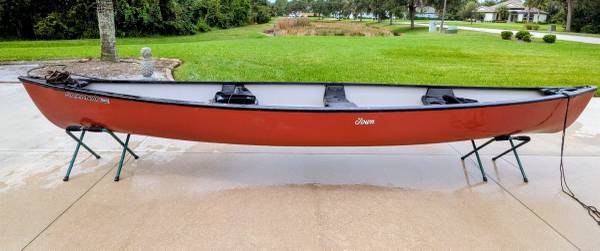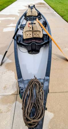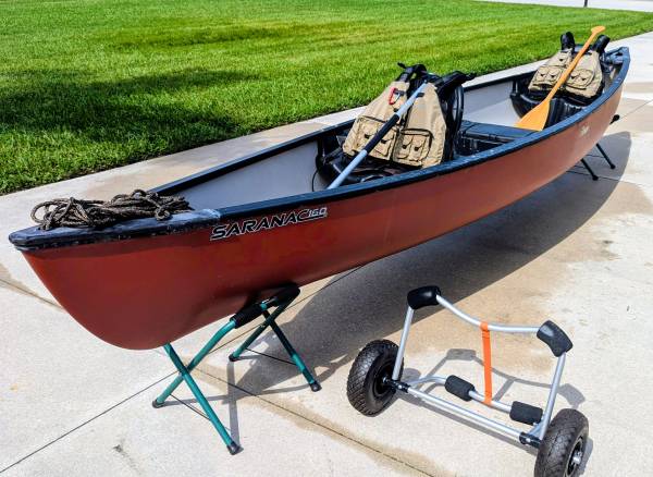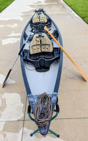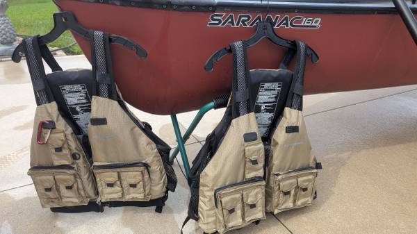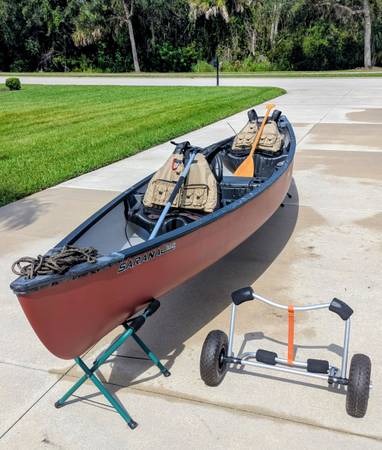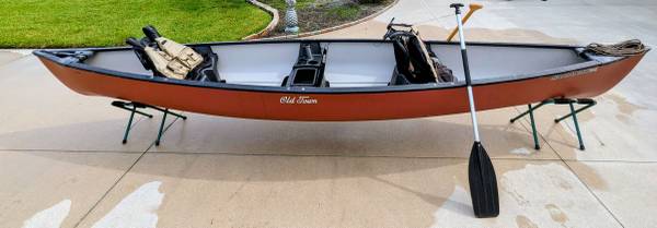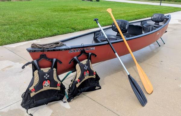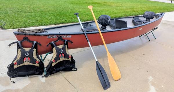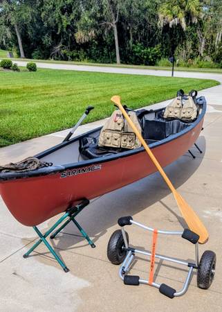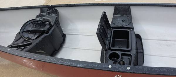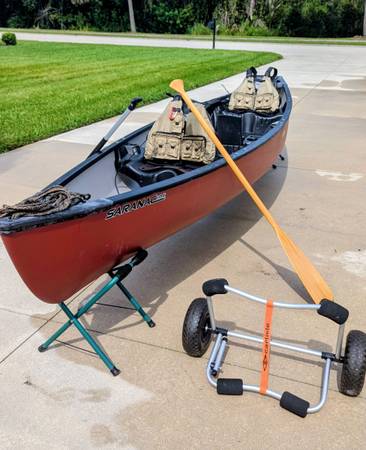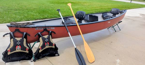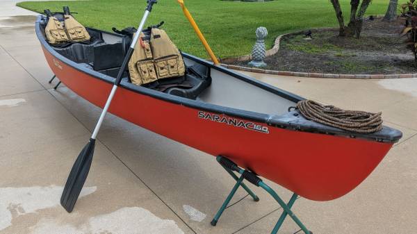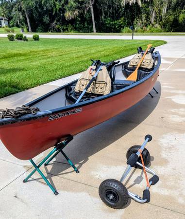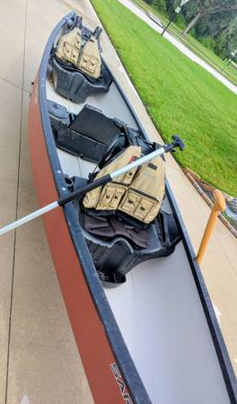 Owned by a retired veteran that doesn't have time to fully enjoy it but keeps it in a great shape. Always kept in the garage, used only 3 times. Comes with 2 Extransport fishing life vests that were used only once, each is valued over $100. Also includes 1 wooden paddle, 1 aluminum paddle, 2 seats, a built-in cooler, and a space for fishing rods and live lures. Also comes with 2 stands for easy storage and canoe transport cart. This is a complete package for a great price, and it is ready for anyone to just put it on the water and enjoy it.