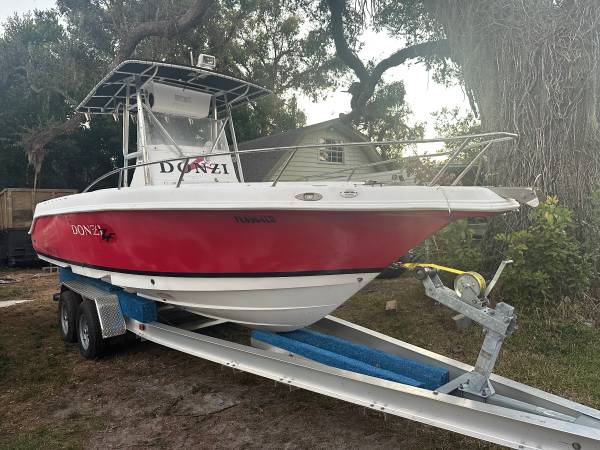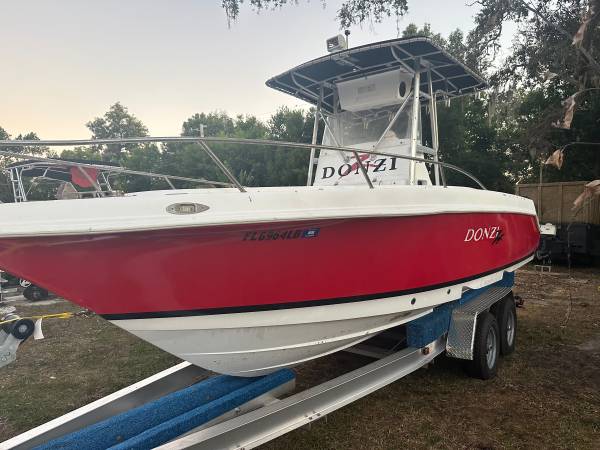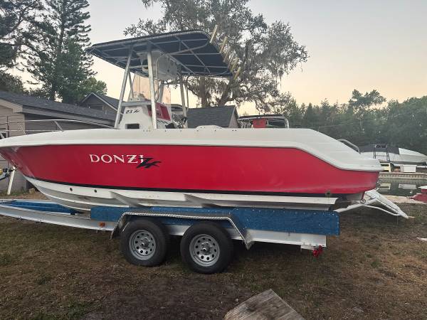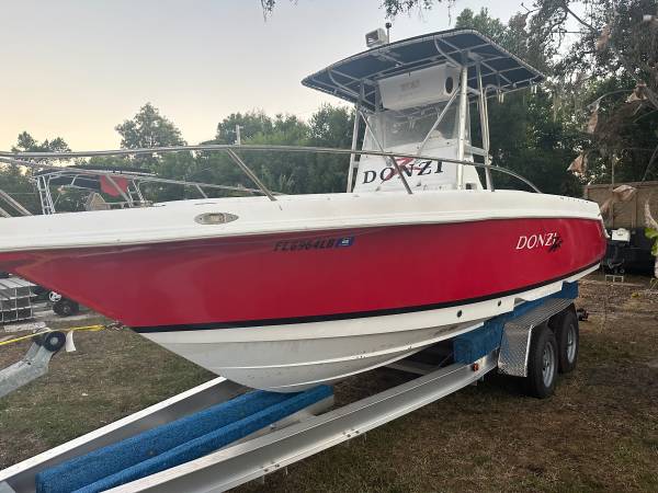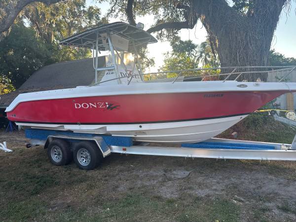 24’ Donzi ZF offshore Center Console fishing boat hull . 2000 model . Fish door and euro transom . Head under console . . T top and leaning post bait well . Boat took on water on the lift in last years storm !!!! No motors no rigging. . Does come with $5,000 aluminum trailer Sell$15,500