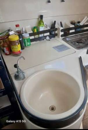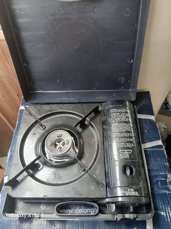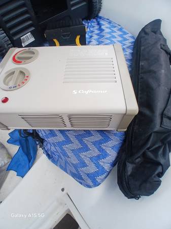 bathroom) has a new Porta potti and space to hang up a few clothes. sink with water faucet pressurized. Mirror, ect. The galley( kitchen) has a deep round sink, a counter area with door that lifts to accommodate a good size cooler and keep it out of sight. Enough space for groceries pantry style. 1 music radios 1 marine cb radios. 2000w sine inverter, 2 oversize boat fenders NEW. solar panels control box. 35hp Johnson 2 cylinders. outboard. 4 water containers with 6 gal capacity each. Bouge Rv 59 qts 12 volts/110 V combo freezer/fridge or all freezer/all fridge. De Longhi new in box tower AC unit, extra mobile self contained lighter fluid 2 burner portable stove, west marine caframo area heater,
