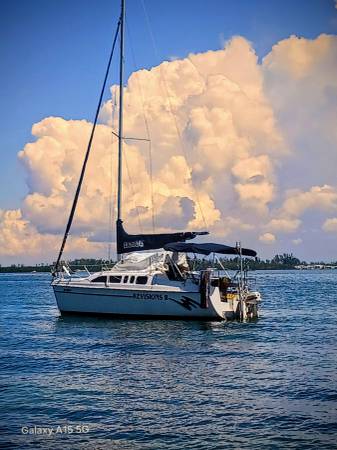 1996 Hunter Legend sailboat 26 feet shoal keel it floats in 22 inches of water. Draft max is 6 feet when down. Also oval cocktail table for the cockpit. Sails are in good condition. Has a new never used gennaker with dousing sock, a new mainsail with reefing points. Standing headroom in galley area is 6 feet. Sleeps 7 inside. Curtains to divide front sleeping area from the main area. Huge dining table great for entertaining guests and family. The head(s