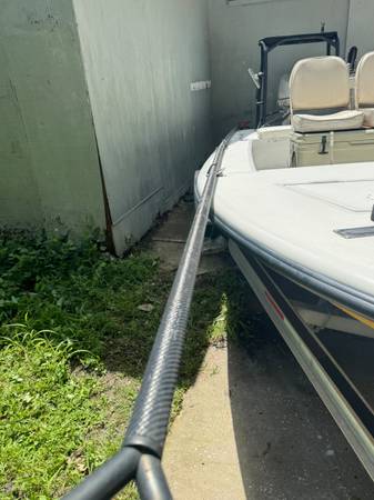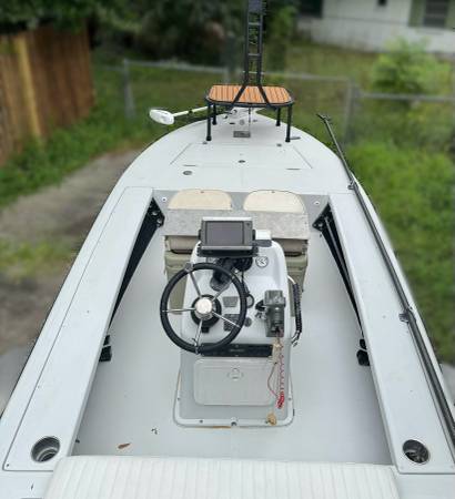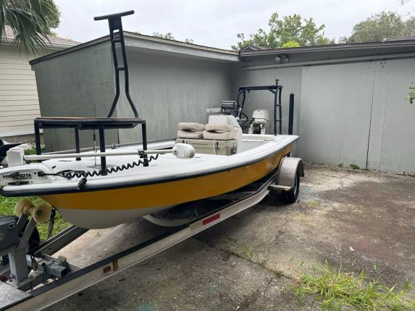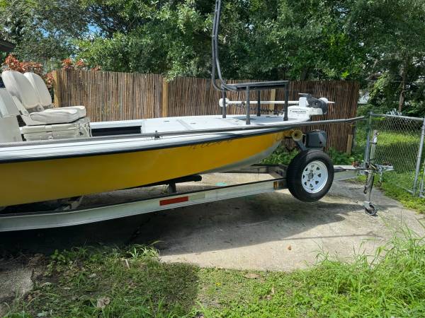This is a very fun, explore anywhere Bay Craft 18, very shallow running tunnel hull with compression plate and jack plate. Total hull weight is approximately 700 lb. weight. She has a carbon fiber Pole and is easy to maneuver. In the bow there is a custom casting platform with a back rest/leaning post to give stability to guests. Live well and extra battery for trolling motor. Engine runs well and the video shows a cold start. Very good on fuel consumption and has a newer large fuel tank in bow. The large Yeti with chairs gives extra seating. It is very user friendly with an extremely shallow trailer and electric winch on the front. I have launched this straight from the beach, no boat ramp needed (Gandy beach). Happy to answer any additional questions.