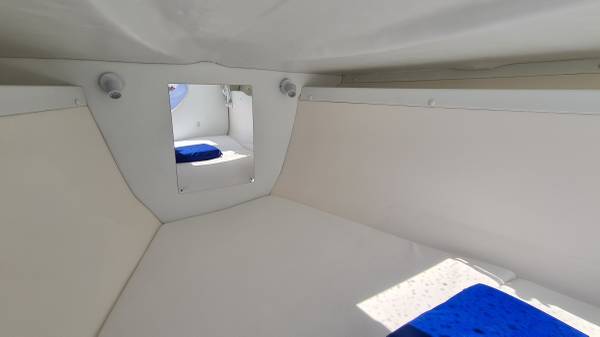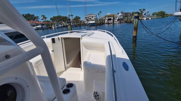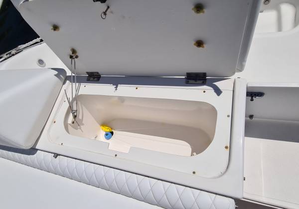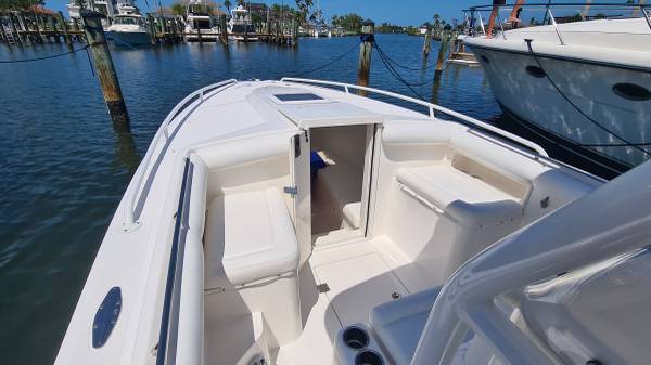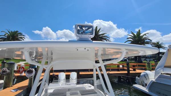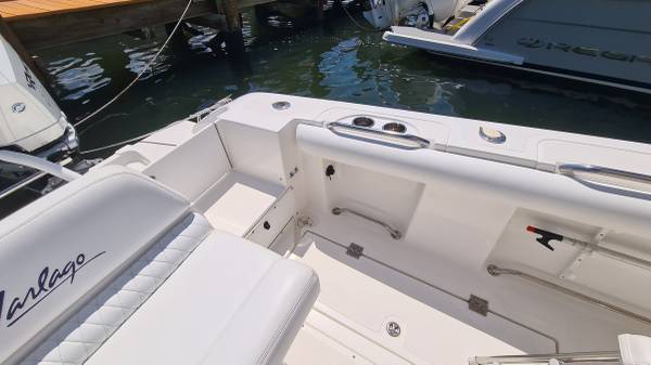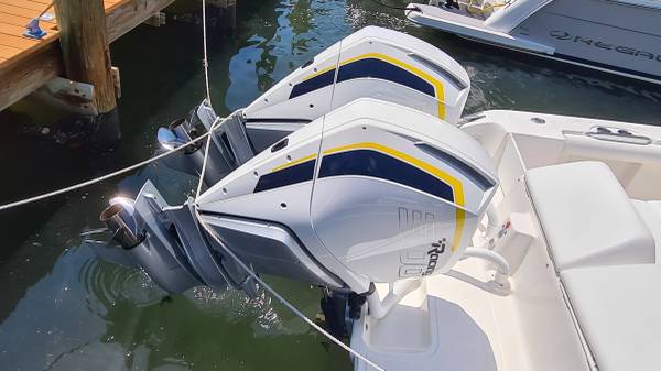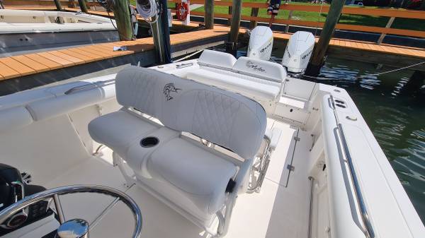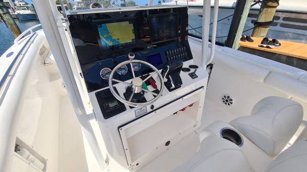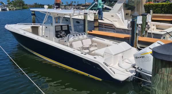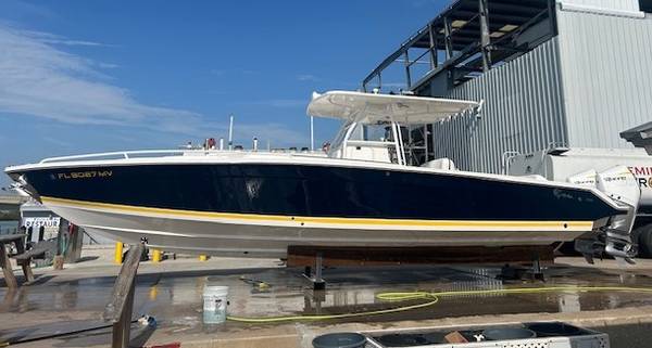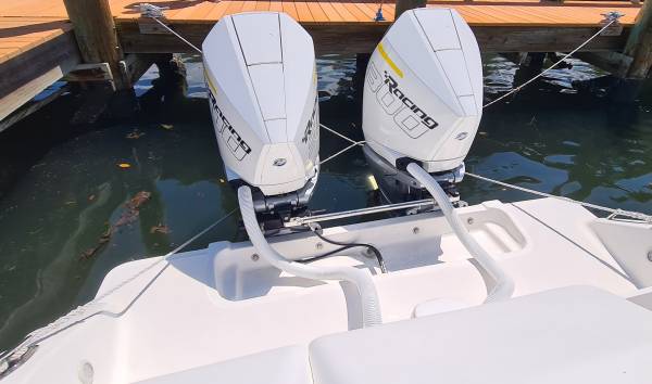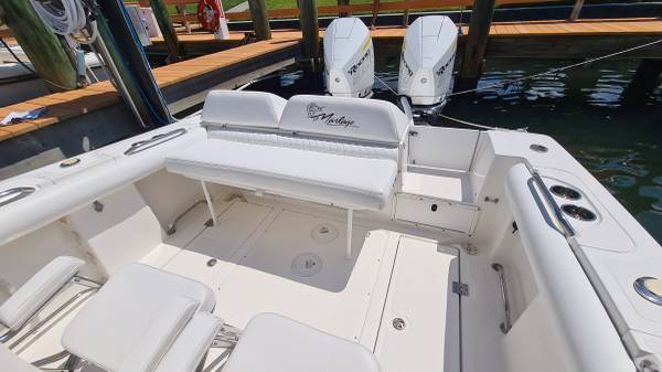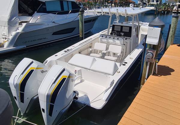 This 35' center console is stored indoors and has all new cockpit electronics and switches, steering, freshwater and saltwater pumps, and cuddy interior, including electric head. She is powered by twin 2023 Mercury Racing 300HP motors with only 158 hours use and 4-bade laser balanced stainless steel props - she flies at 65 mph with minimal load!! Hor motors have a 5-year extended warranty. Her cockpit boasts two huge Garmin displays, new gauges and switches, Merc Vessel View, Fusion stereo and new VHF radio. For fishing, there is a large baitwell, outriggers, plenty of rod holders, transom door and lots of storage. The cuddy cabin has an all new interior and a separate enclosed head, also new. All safety equipment is included. Does not have a trailer, but we can help you find one.