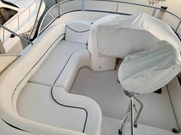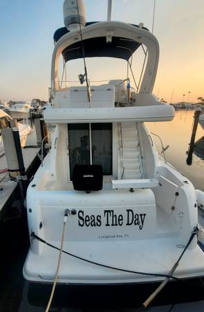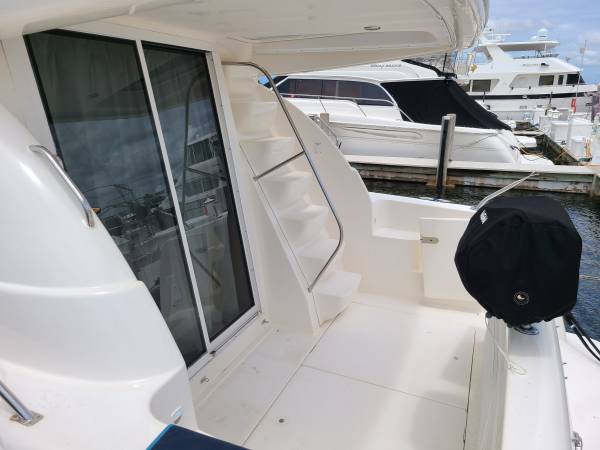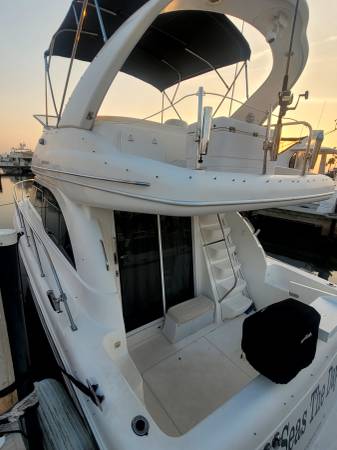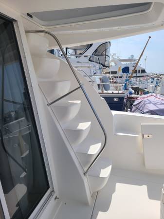 This beautiful motor yacht is loaded with lots of accessories like bow and stern thrusters, windlass, shore power, battery charging system, A/C. She has twin MerCruiser 6.2 Horizon 350HP four-stroke motors with 650 hours of use, 150 since being re-powered in 2017. She has two staterooms, an enclosed head and shower, refrigerator/microwave/stove, and washer/dryer. Electronics include satellite, cable, TV, stereo and Garmin GPS. Lots of recent updates, including NEW swim ladder, upholstery on flybridge, microwave/oven combo, GPS, TV, stereo and speakers, weather station, and security camera. Major service and repairs completed and she is ready to cruise!