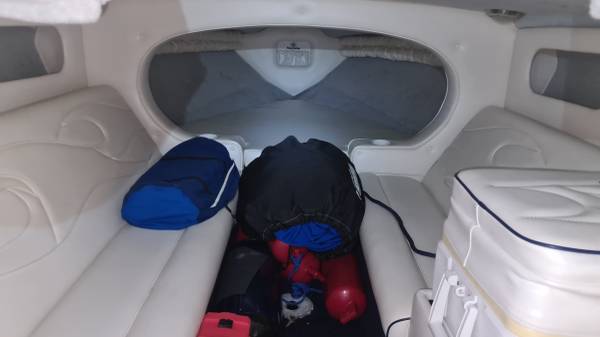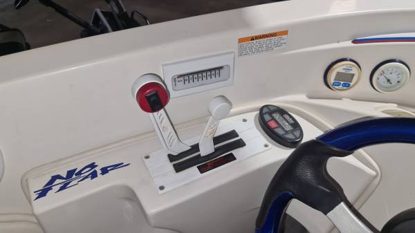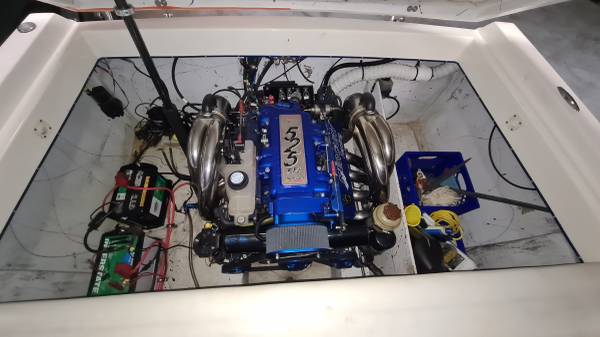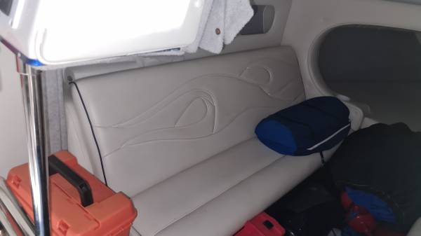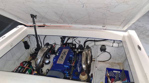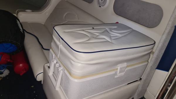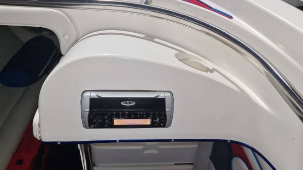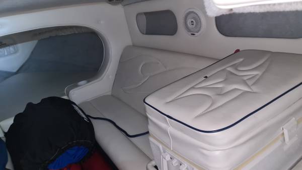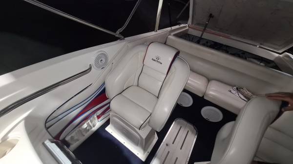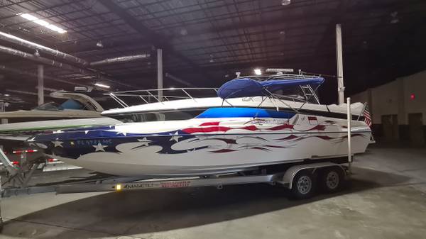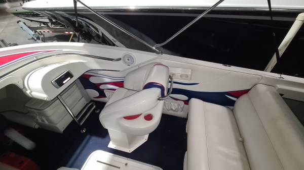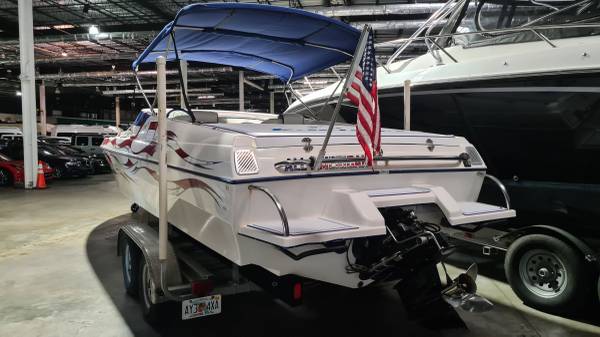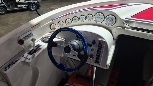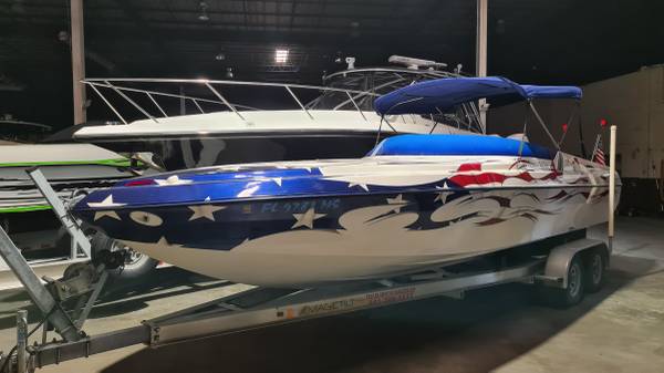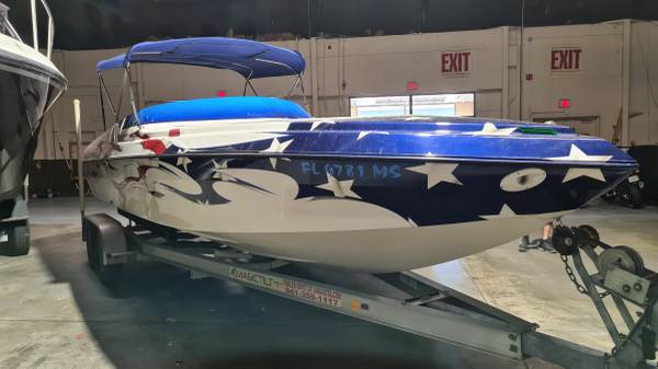 This "ALL AMERICAN" performance day cruiser is a great family cruising (30 mph) boat with a little get up and go (70+ mph)! Her Mercury Racing 525 with only 103 hours has stainless headers-wet exhaust, Racing XR drive with performance 4-blade stainless prop, and full engine/drive service and sea/water pump just 2 boating hours ago. She seats 5 adults comfortably, plus dry cabin seating and berth. There is NEW SeaDeck all over, NEW bimini top and boat cover, 1000-watt stereo system, battery charge system, two stainless swimming ladders, lots of storage and comes with all safety gear/anchors/lines. Comes on 2022 Magic Tilt Tandem aluminum trailer with brakes, barely used. She is stored indoors and under cover.