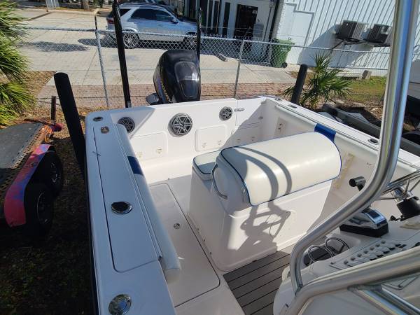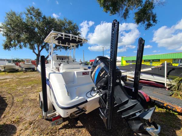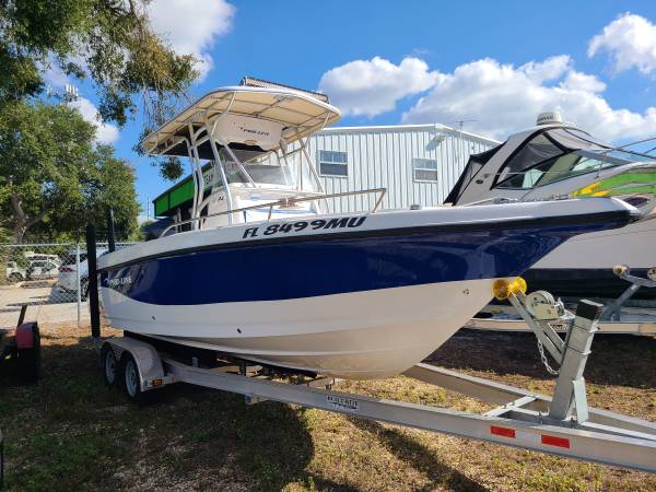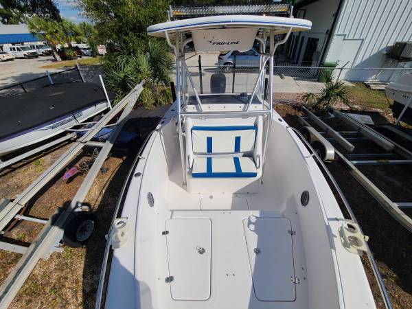 Hit the water and get fishing with this blue Pro-Line center console! Her current owner has taken good care of her and recently added two new power poles, a new 4-blade stainless steel prop and a 2023 Built-Rite tandem trailer. She is powered by a Mercury Optimax 225HP motor with 240 hours of use. (Note: the motor has a mismatched cowling.) She has a baitwell, lots of rod holders, transom door, fresh water washdown and stainless steel ladder. The bow anchor has a windlass and all safety equipment is included. 2023 tandem aluminum trailer is in like new condition!