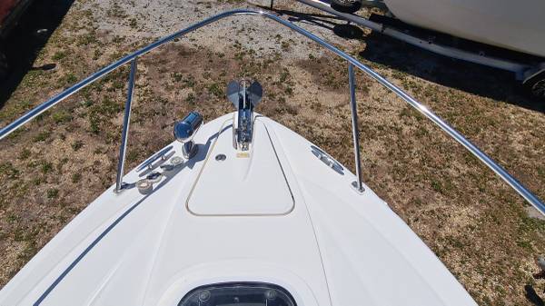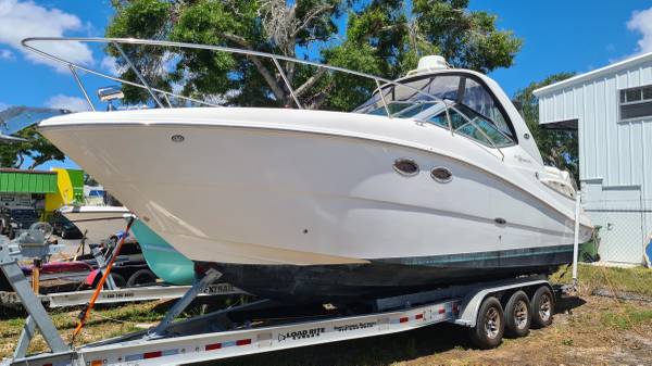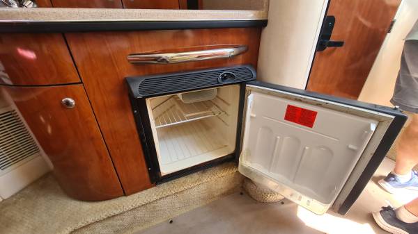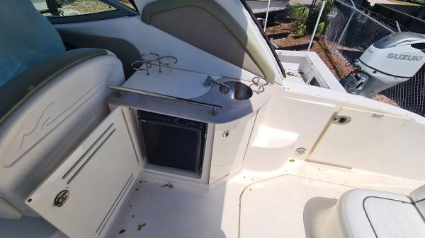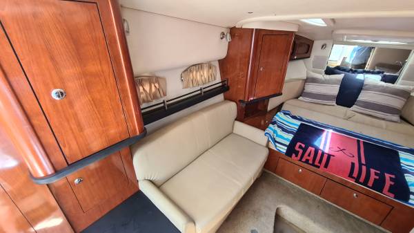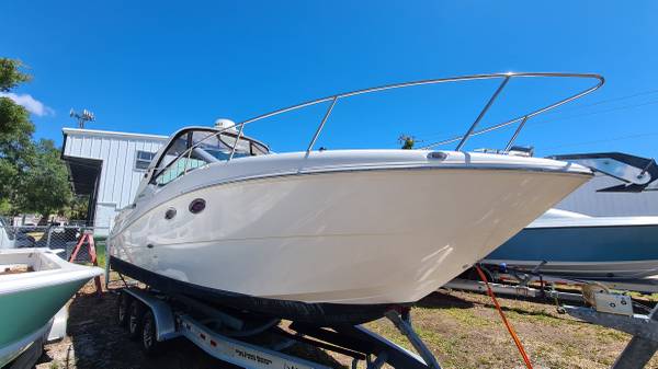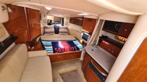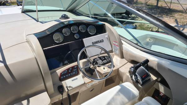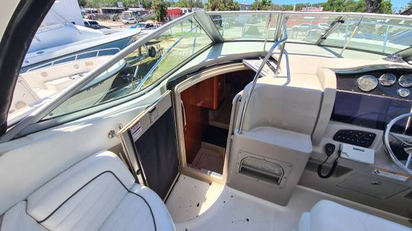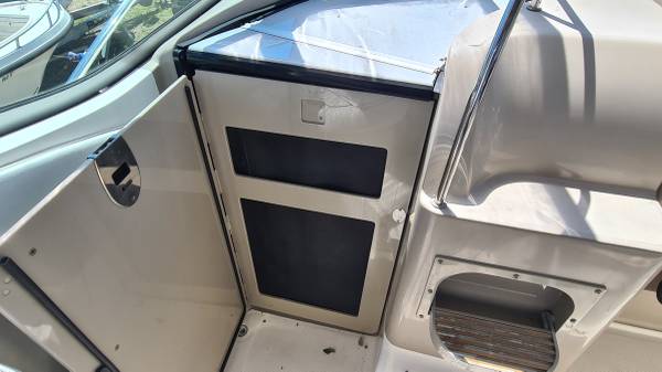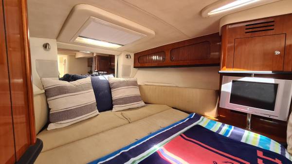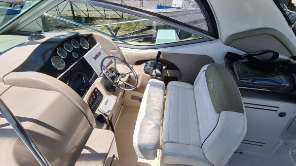 This 29' cruiser packs in everything you need for a weekend of fun! Her elegant cabin has an enclosed head, galley area, and room to sleep 6 in 3 different areas: v-berth, salon and aft cabin. The cockpit has a nice seating area, sink and mini fridge, walk-thru access to the bow and stern, eisenglass enclosure and an aft sunshade. The helm has a bolster seat for 2, a Simrad 12" display for GPS and depth images, VHF and all gauges and controls at your fingertips. She is powered by twin Mercruiser 5.0 MPI Bravo 260HP engines with 230 hours of use. There is A/C, shore power, a battery charging system, windlass, freshwater washdown, bottom paint and a trailer; she comes on a 2022 Load Rite 3-axle trailer with disc brakes, in excellent condition!