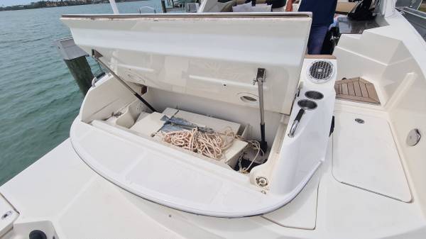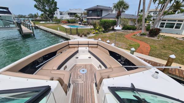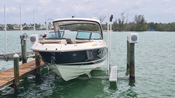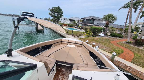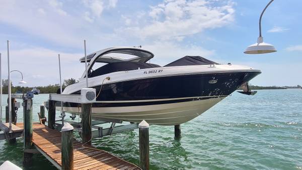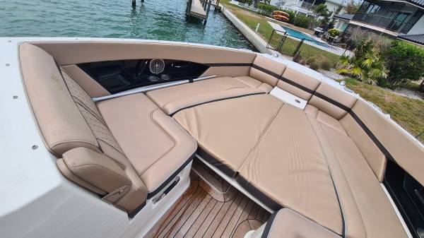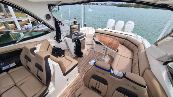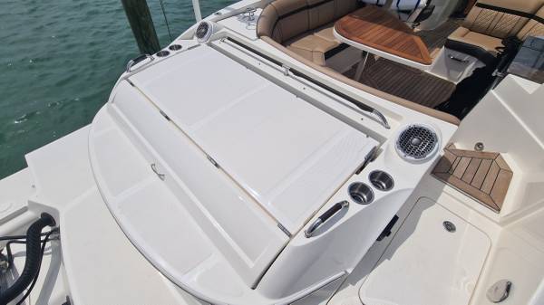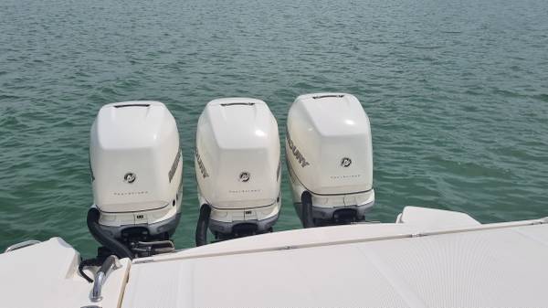 The Sea Ray SLX has it all - seating for everyone all over the boat, power to get up and go, and amenities to make your time on the water great! This SLX is powered by three Mercury Verado 300HP motors, only 170 hours use, serviced regularly. Her helm has room for two, bolster seats, a huge Raymarine touch screen with Merc VesselView, and joystick control. An enclosed head is tucked in the cabin in front of the helm and a spacious berth is in the port-side cabin. Surrounding the helm is an array of seating and complete kitchenette with grill, sink and refrigerator. Step out back to a spacious transom, with a storage box covered with a large fold-out lounge seat. Likewise, the bow offers comfortable lounge seating and plenty of storage. Both areas can be covered from the elements - a large bimini pulls out from the top back, and a sun umbrella provides shade for the front. Additional features like A/C, shore power, battery charge system, both transom and bow fresh water washdown make this boat a complete package.