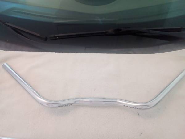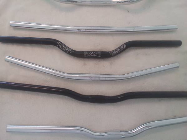 All handlebars are aluminum and 25.4, standard MTB mount. The flat bar and riser bars are $5. The Bontrager Satellite bar Has quite a bit of sweep and is $10. Upgrade your steel bars with aluminum...