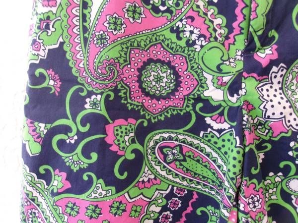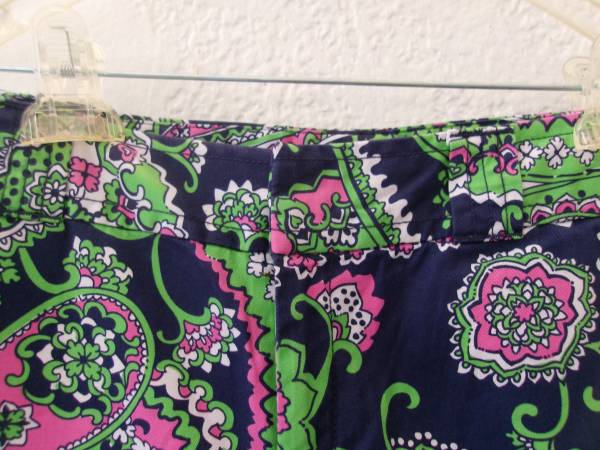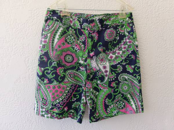 Lilly Pulitzer, vintage, Randi Royal Poinciana, Bermuda shorts in a colorful paisley pattern of blue, green, pink and white, size 6. Made of 100% cotton, they have a flat front with a zip closure, two slant side pockets and 2 button down back pockets. Shorts are lightweight perfect for travel, activewear, or any other casual occasion. Never worn they are in pristine condition, smoke-free and pet-free. A good looking pair of shorts for someone who likes their Lilly! $25. For more information, please contact me.