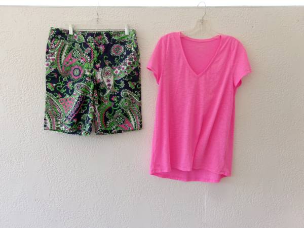 Lilly Pulitzer, signature pink, Etta style top. Made from a poly/cotton blend this is a great piece in a great color that goes with just about anything Lilly! Works to make a great set with the shorts above or used with other Lilly items. Has Lilly in gold on the top back neck of garment, size medium, also has original tag and has not been worn. A great top at half the price $25. For more information, please contact me.