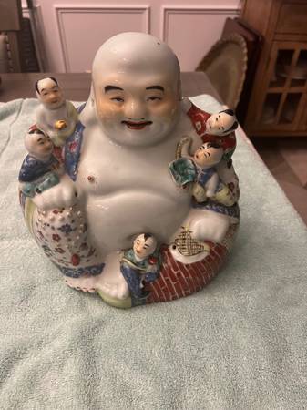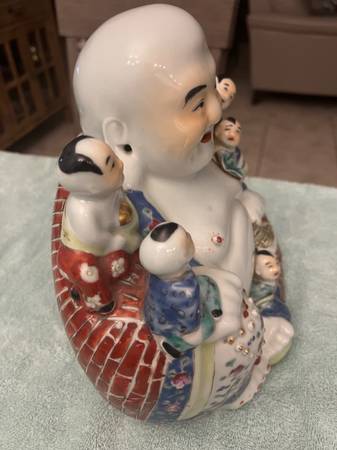 Chinese Famille Rose Porcelain Laughing Buddha 10 1/2 inches tall. There are no discernable chips or imperfections that I can see.