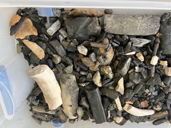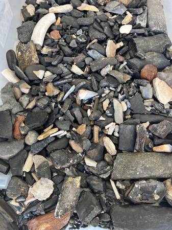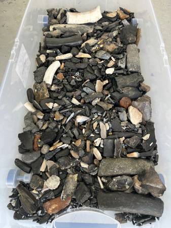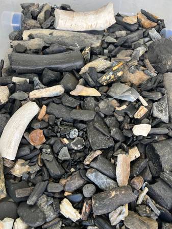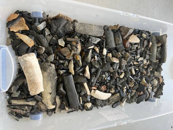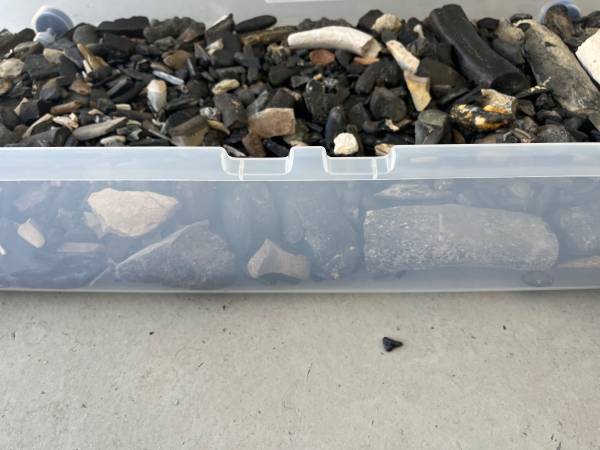 Huge Collection of Shark Teeth and Fossils. Everything from Megalodon to extinct Ice Age Three Toed Horse Teeth, Mastodon Tooth Enamel, Fossil Alligator/Croc Teeth, Petrified Wood and Many Other Different Species. THOUSANDS of Fossils/Shark Teeth all found locally at various land sites. The vast majority of the shark teeth settled naturally on bottom of bin (used for photo purposes) Multiple layers. For scale the storage container is 39 & 1/2 inches long and 20 & 1/4 inches wide. Price is firm. Thanks