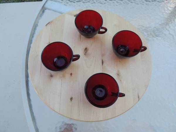 Includes "Anchor Hocking Cup x4 - Royal Ruby Red." These were originally offered by Anchor Hocking as "Punch Bowl Cups" or "Snack Plate Cups". Multiple sets may be available. Individual pieces may...