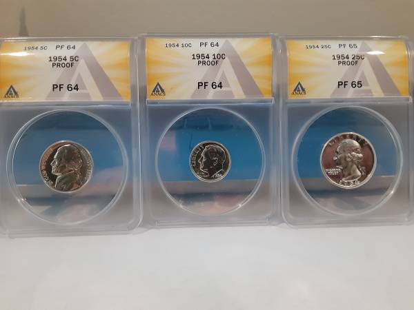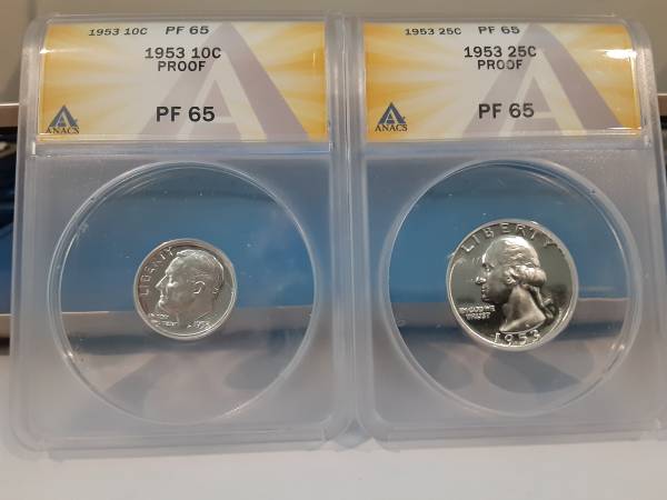 Selling the following graded silver proof coins 1953 Prf-65 Roosevelt 10c and Prf.-65 Washington 25c 1954 Prf.-64 Jefferson 5c (non silver) 1954 Prf.-64 Roosevelt 10c and a 1954 Prf.-65 Washington 25c Buy all five coins for $75