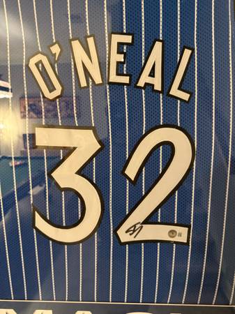 An authenticated witnessed and certified signed NBA jersey of Shaquille O’Neal while playing for the Orlando Magic. It is framed along with team logos, action photos, and Beckett certification number