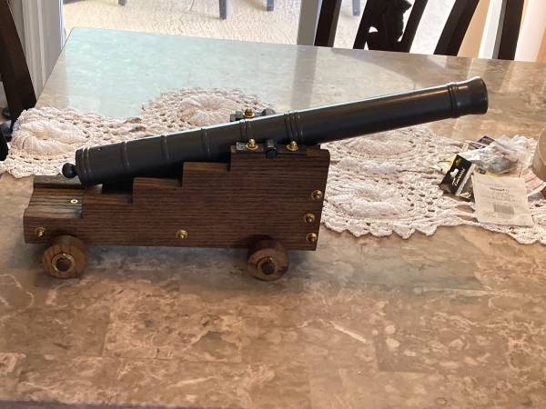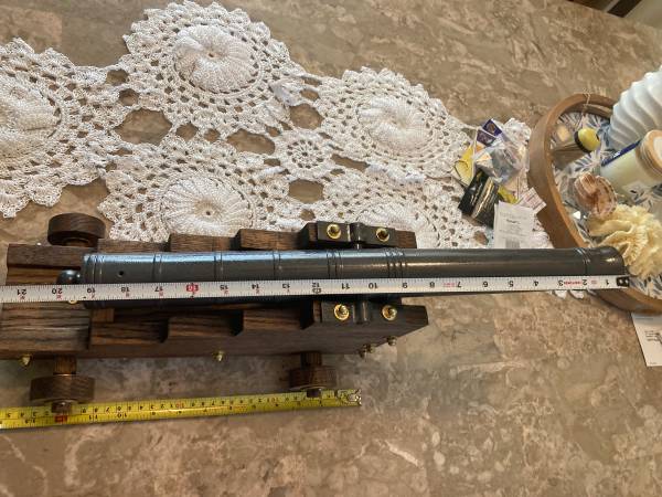 This cannon is a salute cannon. noise maker. It has a 20" Barrel solid steel, with a 14" long 7" wide oak carriage.