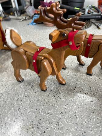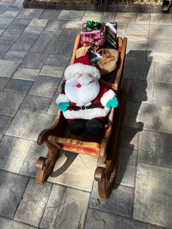 Unique wooden sled with Santa, muslin bag and presents with 6 reindeer