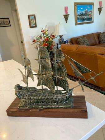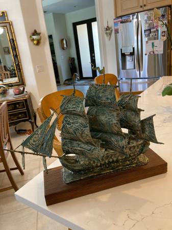 Vintage Schooner made with a form of metal and antiqued with a touch of blue/green on the entire piece, mounted on a wood base. Classic and antique finish. Decorative for Den, Office, yacht or boat. Measures 19"Lx6-1/4"W x 15-1/2"H. In excellent condition.