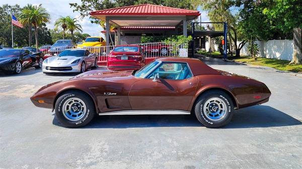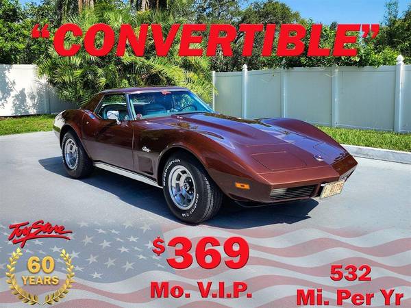 CORVETTE 1974 CONVERTIBLE, Dark Brown with Silver Leather Interior, Automatic Transmission, Power Steering, Power Brakes, AM-FM Radio, Aluminum Wheels, Factory Air Conditioning, Special Ordered. This vehicle is believed to be one family owned since new with accurate mileage. This Corvette also features an auxiliary hardtop. Exceptionally low mileage - This Corvette is truly a Blast From The Past L48 Engine 350 Cubic Inch 195 H.P. V8. This vehicle qualifies for our exclusive V.I.P. financing plan. Sale $33,875 / $369 mo. V.I.P. Call for details. Toy Store, Largo, Fl. 727-585-6000 www.vettenet.com Open 6 days, Sunday by appointment. WE BUY CLEAN CORVETTES! Shipping assistance available to 48 states. We can help with less than perfect credit. SELLING QUALITY LOW MILEAGE CORVETTES FOR 60 YEARS! EXPECT TO BE IMPRESSED PERFORMANCE SPOKEN HERE