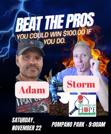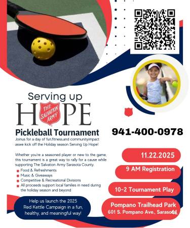 We are having a pickleball tournament on Saturday, November 22, 8:00-1:00, benefiting the Salvation Army. T o pro players will be there and if you and your partner can beat them in a game, you will $100.00. Pompano Park, 601 S Pompano Ave. Sarasota FL 34233