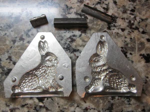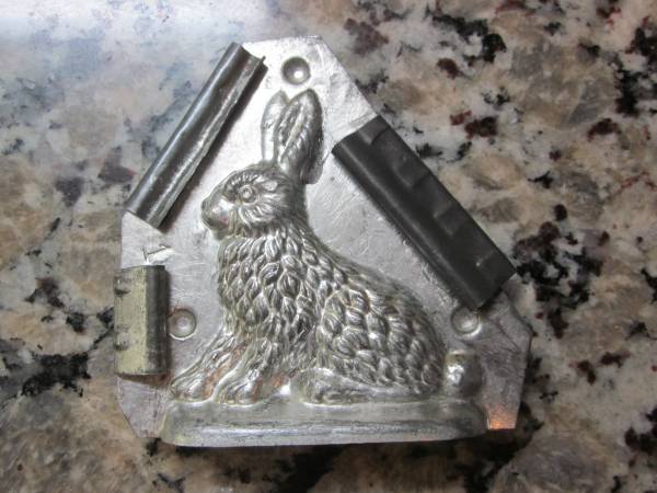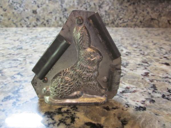 Make your own Chocolate Bunnies! Antique Rabbit Chocolate Mold. Metal Rabbit Mold with 3 Clips for use or Kitchen Décor. Simply adorable metal bunny was made in America. Mold comes with three clips to keep it secure while chocolate is hardening. Clips create a nice, tight closure. Measures 4" tall and 4" wide. Use this mold to create your own handcrafted items, whether it is candy or soap or any other medium you think would work in this sweet piece. When not in use, you may choose to display it ! Metal Chocolate Mold Bunny number 1 by Jaburg Brothers, Candy Mold, Rabbit Farmhouse Décor. Very Rare Rabbit Mold. Stamped Jaburg Brothers 1-3 Worth St. N.Y.C. This is a tin mold. I do not see any copper in the mold even though the photo has a copper sheen from its surroundings. If you would you like to see this item, I am in the area of SR70 & Creekwood Blvd, Bradenton. Message me to arrange a time.