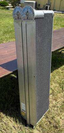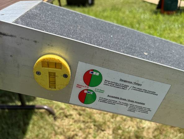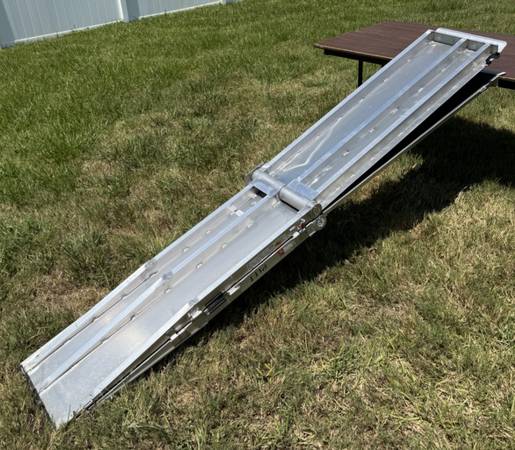 This is a portable mobility ramp used for scooters, power chairs, and wheel chairs. I used it primarily for transferring Mobility Scooters into and out of a van. It can also be used as a ramp for a couple of steps. Rated for 600 lbs (dual axle), or 300 lbs (single axle). Completely unfolded it measures 8 feet long by 30" wide. Folded up it measures 51 inches by 15 inched by 9 inches. Made of aluminum and made in the USA by Prairie View Industries. It has side rails to prevent roll-off. Pick-up only. Very good condition with no damage. Slip resistant textured base. Works well with vans, minivans, SUV's, trucks.