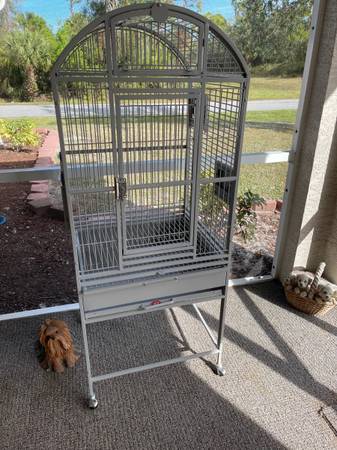 Like new bird cage 2ft across front and back 22 inches on the sides 58 and a half inches tall.