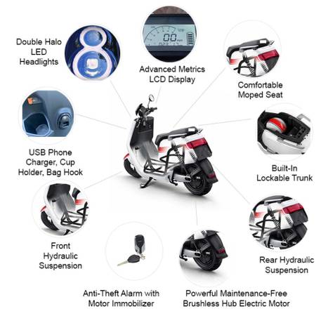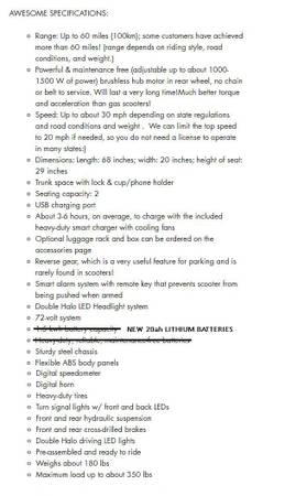 2020 Zoom Scooter with very low miles and less than 5 miles on new 20Ah LiFePO4 lithium batteries. These are the new "safe" lithium batteries which increase the scooters range dramatically (50+miles). The correct battery charger is included. The lithium batteries are a drop in replacement for the original lead acid batteries. See the pictures for complete information on the scooter as originally shipped. Please feel free to make an offer.